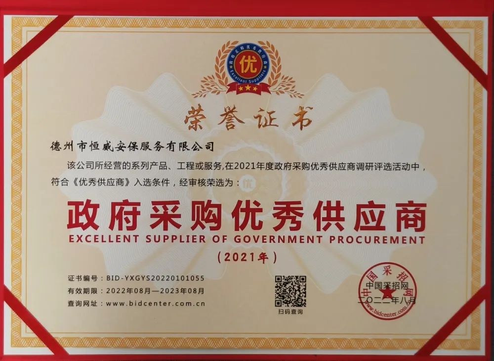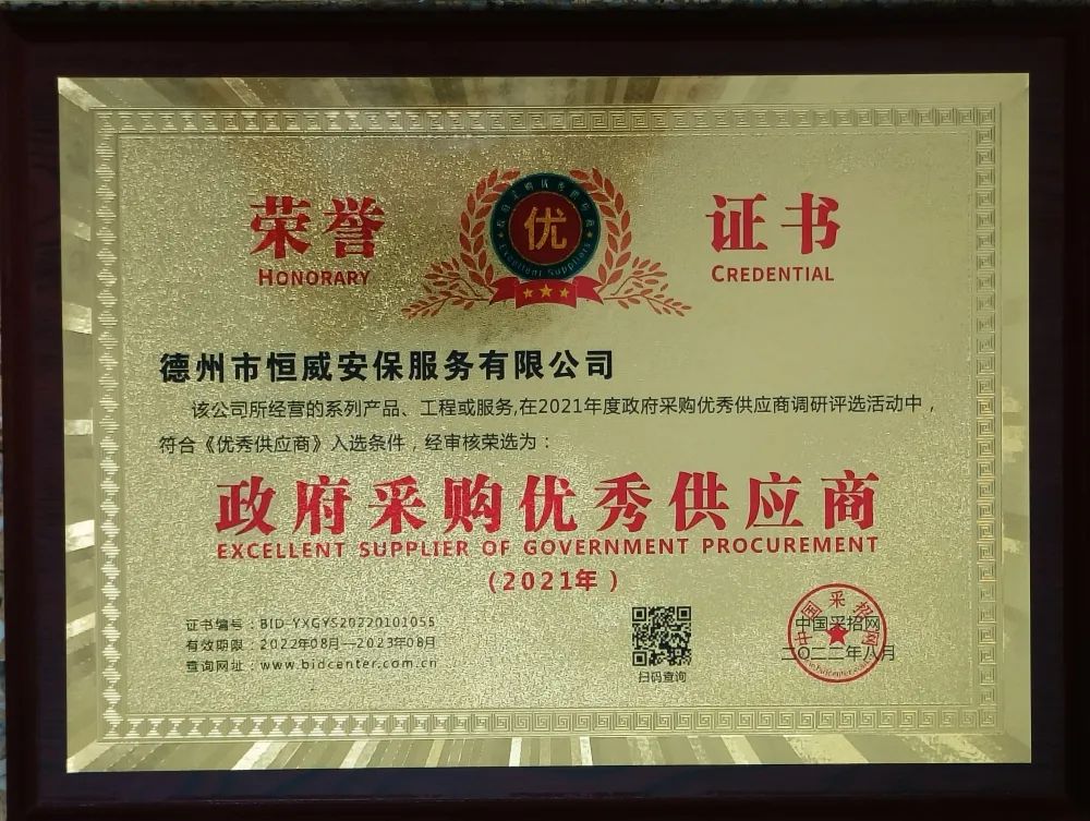 喜報!德州市恒威安保服務有限公司經中國采招網對全國供應商嚴格篩選考評后,被評為“,采購優良供應商”,并頒發了證書和獎牌。