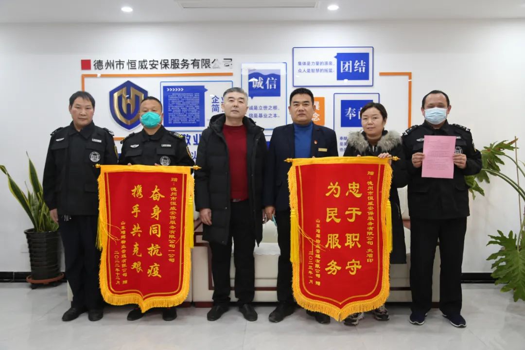 1月3日,山東增輝物業管理有限公司總經理楊曉晟一行到訪德州市恒威安保服務有限公司贈送錦旗,向在疫情防控期間沖鋒在前、堅守一線的恒威保安員表示由衷地感謝。副總經理王洪林、張有利參與接待。