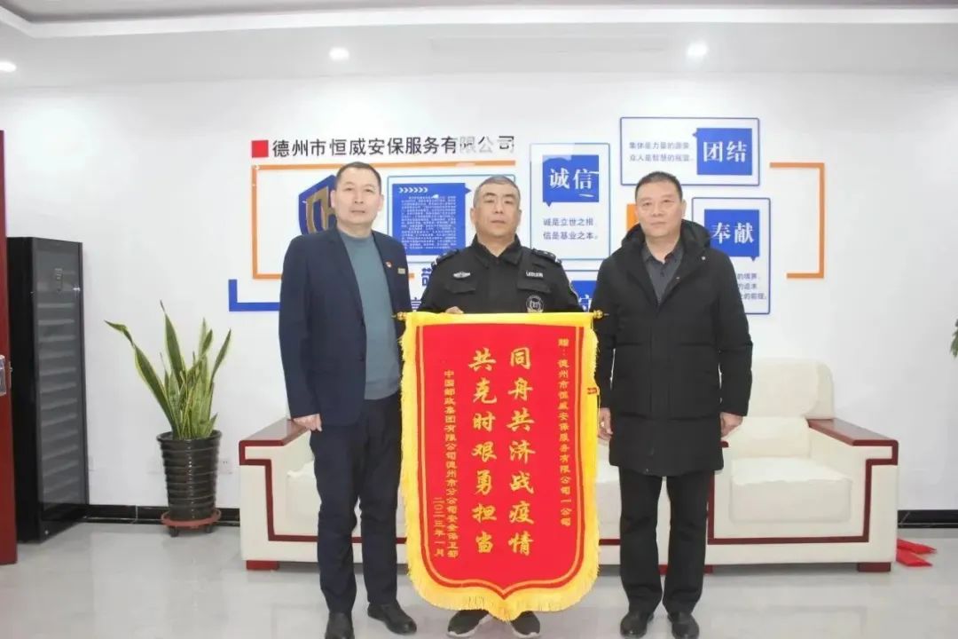 1月17日,中國郵政集團有限公司德州市分公司徐峰主任一行到訪德州市恒威安保服務有限公司并贈送錦旗,贊揚恒威安保駐郵政集團德州分公司班組履職盡責、踏實認真、勇于擔當,特別是在疫情期間安保人員24小時堅守工作崗位,嚴格防疫,切實為我公司安全有序運轉提供了有力的安全保障,對恒威安保人所做出的努力及無私奉獻、敬業忘我的出色表現表示充分肯定和衷心感謝。