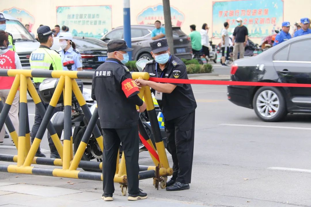 7:40,保安員積較協助公安機關在考場外劃設安全區域,拉設安全警戒帶,現場疏導群眾、讓考生順暢、安全入場。隊員們各司其職、履職盡責,考點學子有序進入,校門口秩序井然。