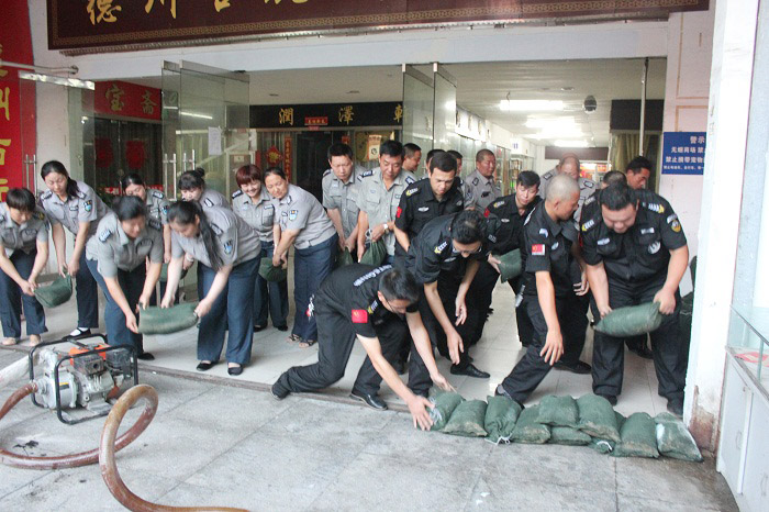 王新剛大隊長現場查勘水情,做簡要戰前動員。按一大隊抗洪搶險應急處置預案迅速將人員分為現場險情處置、大廳警戒疏散、道路車輛管理、搶險物資轉運四個戰斗小組,快速投入積水排放、電路維護、人員疏散、構筑隔水墻的搶險工作。經過近一小時的努力,險情排除,避免了客戶單位的經濟損失。